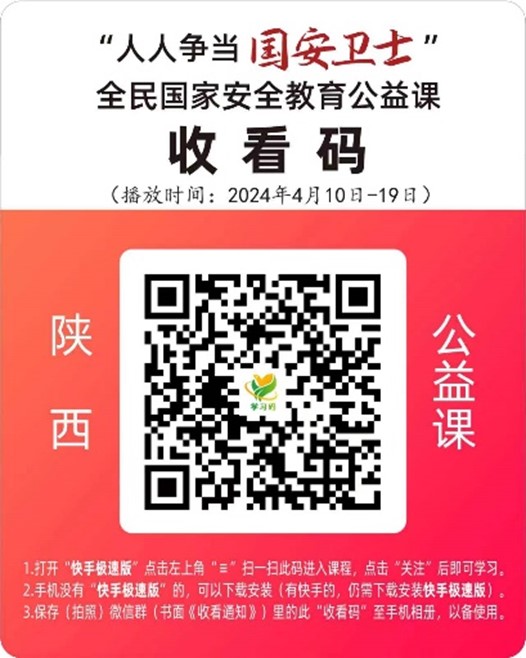 (注意:保存上方活动二维码至“相册”备用,每天需使用“快手极速版”扫码识别(请勿使用微信扫一扫)进入学习。连续8天点击“签到”学习的,可获得《全民国家安全教育结业证书》)。