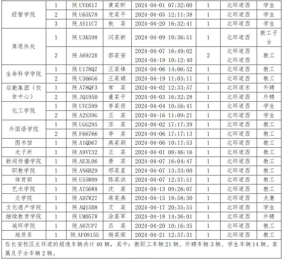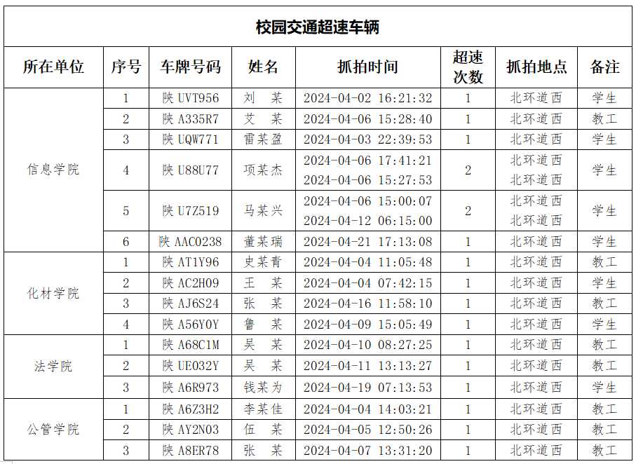 为加强校内道路交通安全管理,规范校内交通秩序,根据《星空app官网校园道路交通管理办法》有关要求,现将2024年4月校园交通违章车辆予以曝光,4月份教工超速车辆占52%、学生超速车辆占35%、外聘职工及教工家属车辆占12%,请所在单位加强对本单位违章师生员工的教育和管理,对于校内曝光超速的学生车辆将取消下一年度的通行证办理资格。