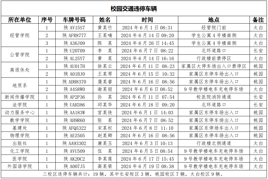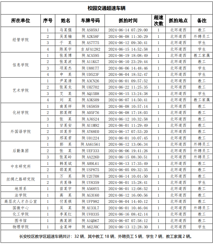 为加强校内道路交通安全管理,规范校内交通秩序,根据《星空app官网校园道路交通管理办法》有关要求,现将2024年6月校园交通违章车辆予以曝光,所在单位负责对本单位违章师生员工进行交通安全教育和日常管理,对于校内曝光超速的学生车辆将取消下一年度的通行证办理资格。