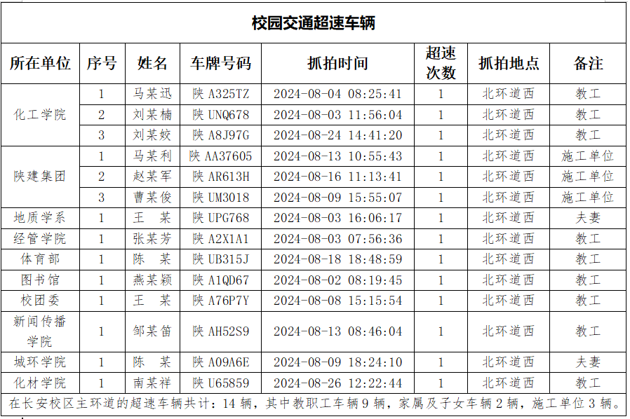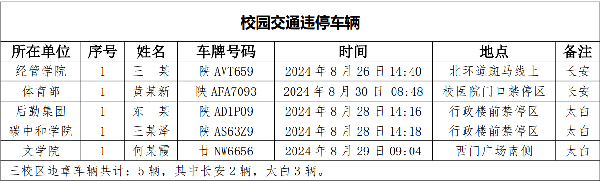 为一步加强校园交通管理,保障校园交通安全有序,维护学校正常的教学、科研和生活秩序以及师生员工的人身财产安全,根据《星空app官网校园交通安全管理规定》有关要求, 现将2024年8月校园交通违章车辆予以曝光,具体情况如下表。