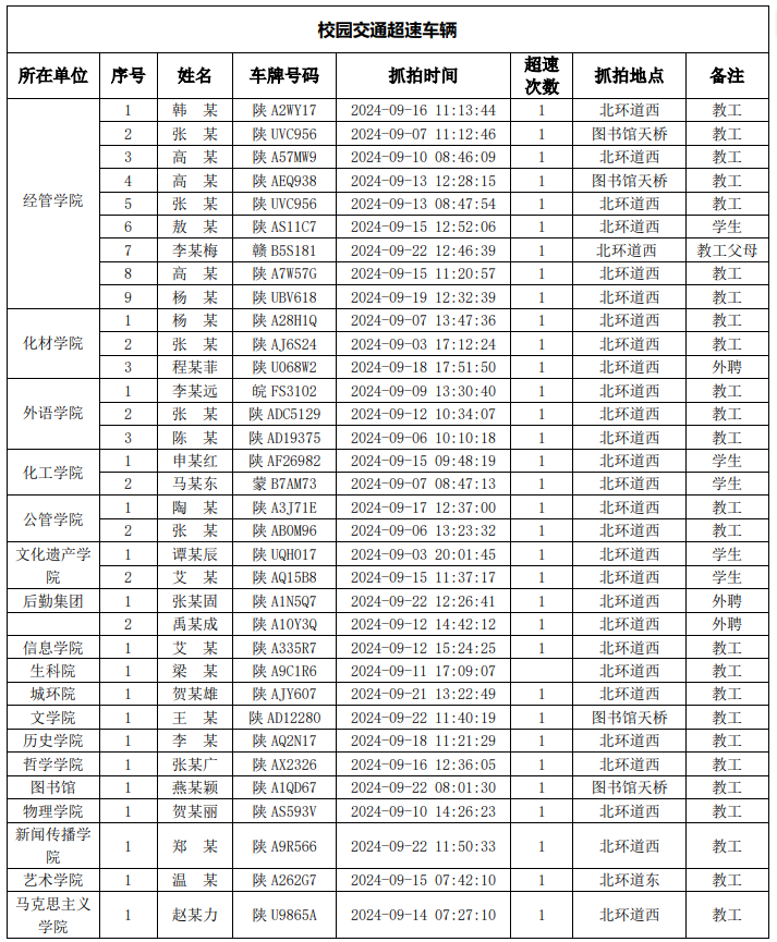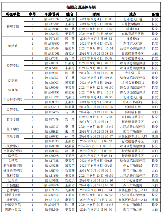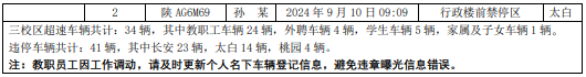 为一步加强校园交通管理,保障校园交通安全有序,维护学校正常的教学、科研和生活秩序以及师生员工的人身财产安全,根据《星空app官网校园交通安全管理规定》有关要求, 现将2024年9月校园交通违章车辆予以曝光,具体情况如下表。
