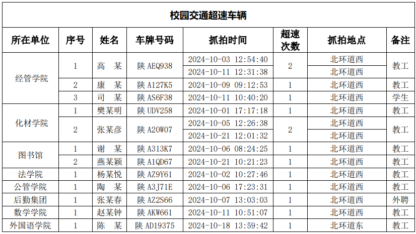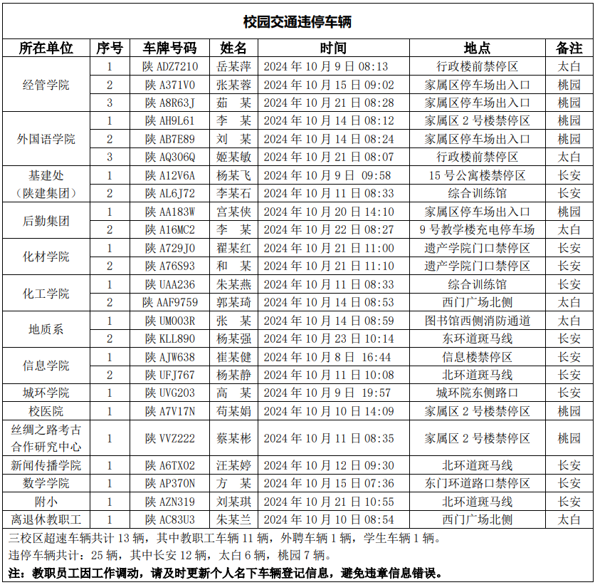 为进一步加强校园交通管理,保障校园交通安全有序,维护学校正常的教学、科研和生活秩序以及师生员工的人身财产安全,根据《星空app官网校园交通安全管理规定》有关要求, 现将2024年10月校园交通违章车辆予以曝光,具体情况如下表。