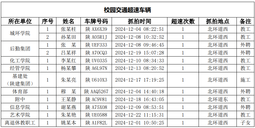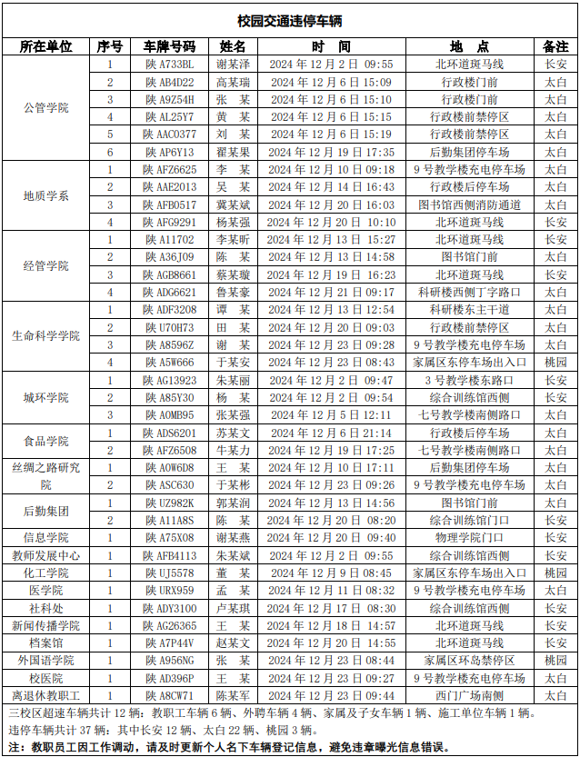 为进一步加强校园交通管理,保障校园交通安全有序,维护学校正常的教学、科研和生活秩序以及师生员工的人身财产安全,根据《星空app官网校园交通安全管理规定》有关要求, 现将2024年11月校园交通违章车辆予以曝光,具体情况如下表。