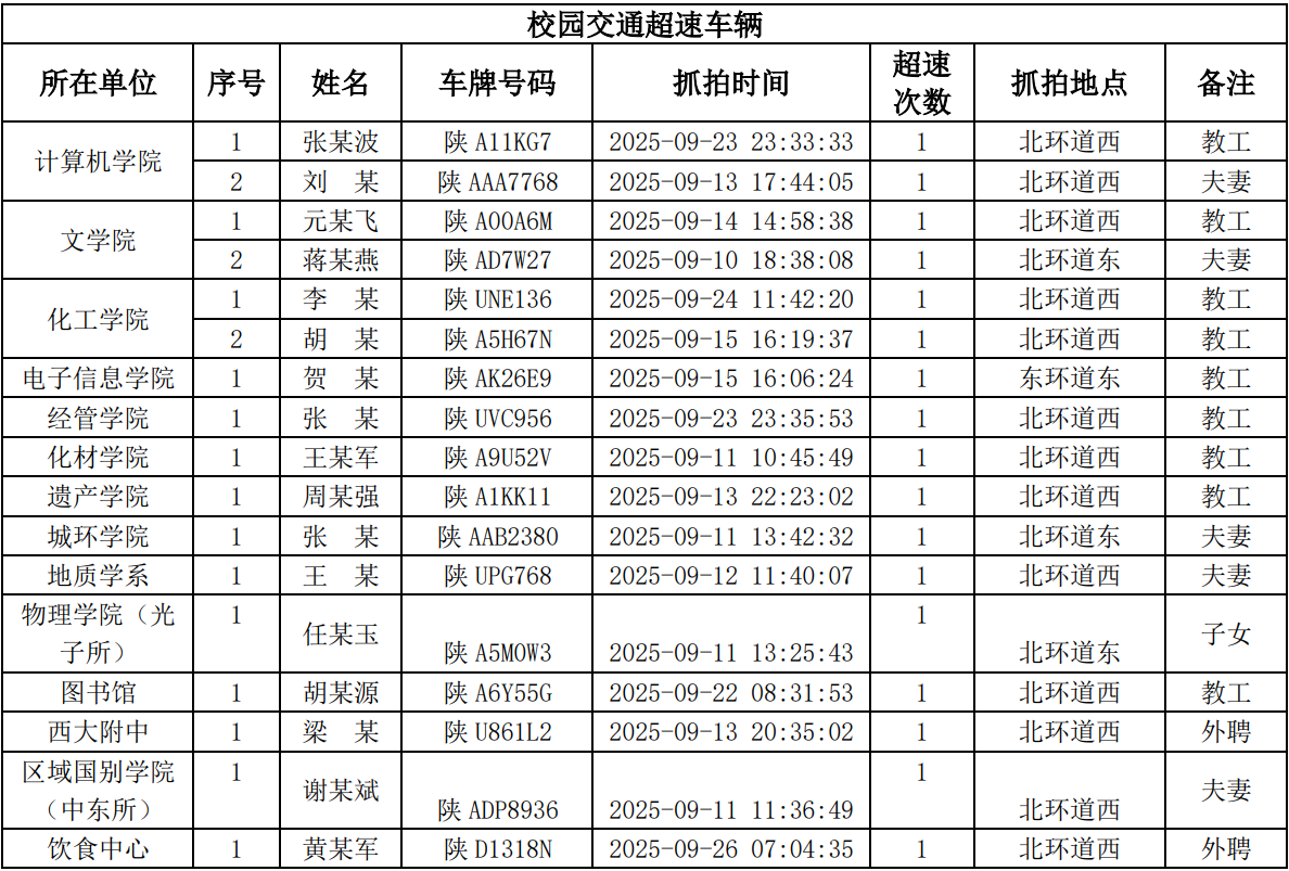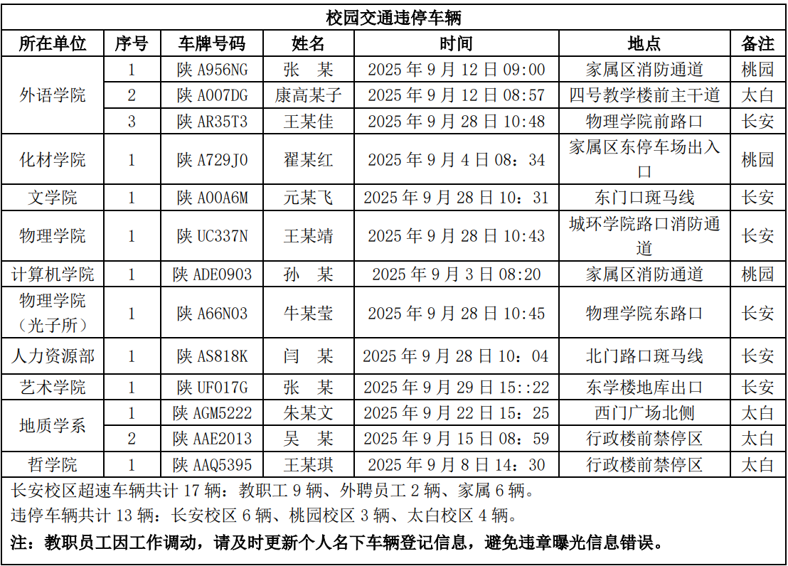 为进一步加强校园交通管理,保障校园交通安全有序,维护学校正常的教学、科研和生活秩序,切实保护师生员工的人身财产安全,根据《星空app官网校园交通安全管理规定》的相关要求,现将2025年9月校园交通违章车辆予以曝光,具体要求与违章信息如下: