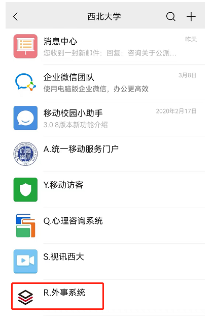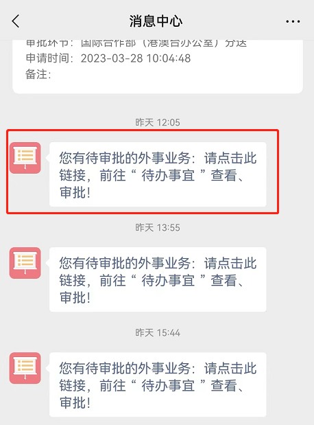 通过手机微信“星空app官网”-“消息中心”-“R.外事系统”路径,可以进行业务查看及审批。