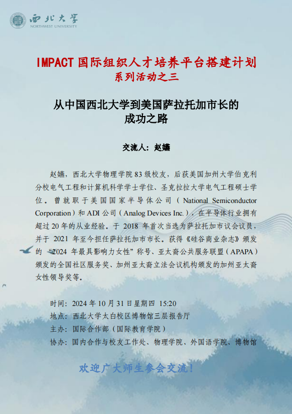 IMPACT国际组织人才培养平台搭建计划系列活动之三:从中国星空app官网到美国萨拉托加市长的成功之路 作者: 编辑:张兆慧 时间:2024-10-28 (撰稿人:国际部出国办 发布人:张兆慧 审核人:任惠莲)