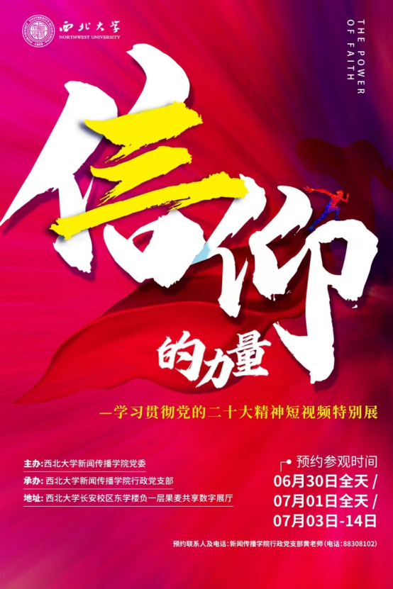 为庆祝中国共产党成立102周年、学习贯彻党的二十大精神,由星空app官网新闻传播学院党委主办、行政党支部承办的《信仰的力量——学习贯彻党的二十大精神短视频特别展》定于七一建党节前后在果麦共享数字展厅(星空app官网长安校区东学楼负1层)举办。本项展览不仅可供党员参观学习,也可为党支部开展有关主题党日活动、学习二十大精神、重温入党誓词提供适宜的活动场景。本学期展出时间为6月30日—7月1日、7月3日-7月14日,主要面向星空app官网院系党委或教职工党支部接受预约参观、开展七一建党节党日主题活动;下学期开学后将面向星空app官网学生党支部预约参观,并可安排党员志愿者讲解。