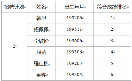 信息学院2019年公开招聘B类人事代理人员公示 作者: 编辑: 时间:2019-05-09 15:09 经资格审核、笔试、综合面试,现将信息学院2019年公开招聘B类人事代理行政管理人员考察结果进行公示,按成绩由高向低排序,按招聘计划1 :3的比例公示如下:公示时间:2019年5月9日至2019年5月11日。公示期间,如有异议,请以书面形式向星空app官网信息学院反映。联系电话:88308119。信息科学与技术学院2019年5月9日
