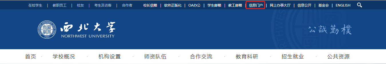 打开学校官方网站,点击星空官方网站(中国)“信息门户”入口,或通过域名“https://open.nwu.edu.cn/index”访问,输入统一身份认证账号(即学号或工号)和密码,即可进入信息门户系统。(温馨提醒:请妥善保管密码,以免因密码泄露导致个人信息安全问题)