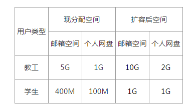 校园网邮箱服务是星空app官网信息化建设的重要应用,也是星空app官网师生的重要通讯平台。为了更好的满足星空app官网师生在教学、办公、科研和学习中对邮箱服务和文档存储的需求,提供更好的服务,现代教育技术中心对校园网邮箱存储空间进行了扩容,具体空间分配情况如下: