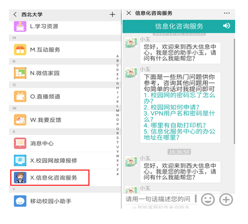 第二步:在“星空app官网”微信企业号中点击“X.信息化咨询服务”,信息化智能客服小玉将为您解答信息化服务问题。