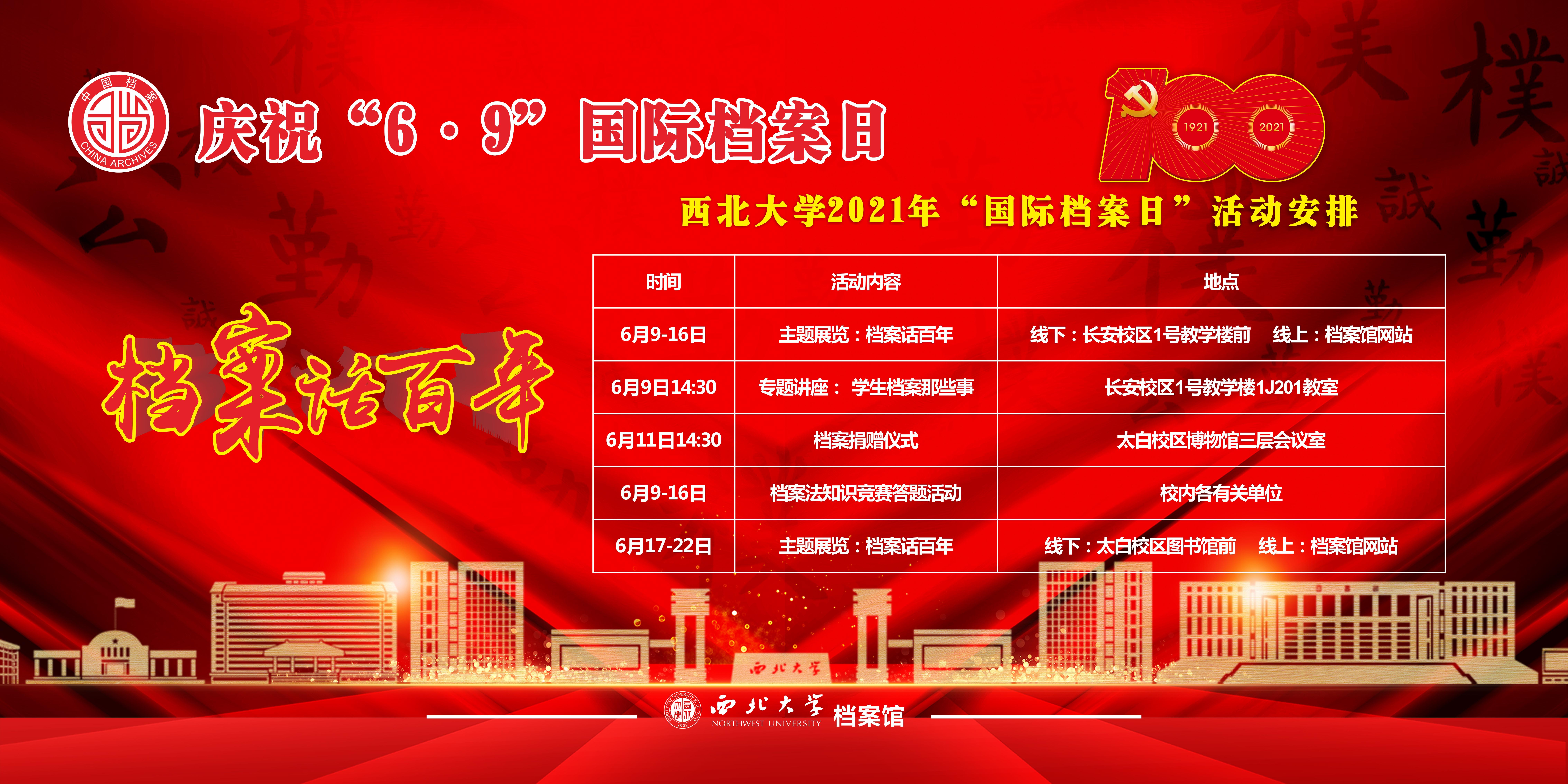星空app官网2021年国际档案日活动安排 作者: 编辑:孙可佳 时间:2021-06-08 为庆祝中国共产党成立100周年,宣传贯彻落实新修订的《中华人民共和国档案法》,不断增强全校师生档案意识,助力学校“双一流”建设,积极发挥档案工作“记载历史、传承文明、服务未来”的作用和档案“存凭、留史、资政、育人”的功能,讲好“西大故事”,根据国家档案局《2021年全国档案宣传工作要点》等有关精神,学校举办第七届以“档案话百年”为主题的国际档案日系列宣传活动。具体活动安排如下,欢迎广大师生踊跃参加!