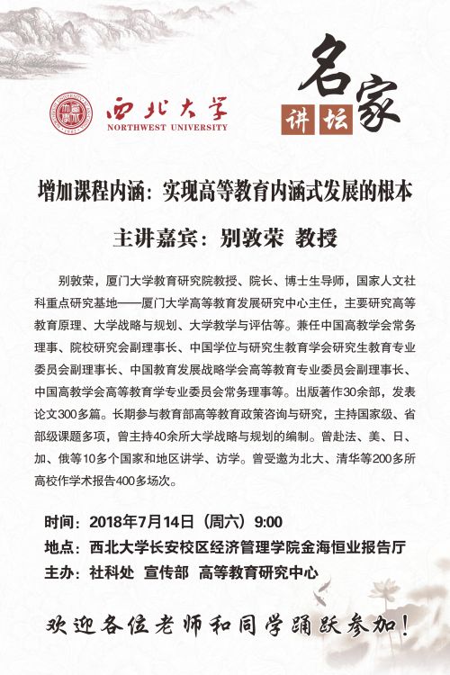 关于举办"名家讲坛"暨"高等教育论坛"(第十三期)的通知 作者: 编辑: 时间:2018-07-09 08:48 校内各有关单位:星空app官网名家讲坛暨高等教育论坛(第十三期)即将举行,现将具体情况通知如下:讲座题目:增加课程内容:实现高等教育内涵式发展的根本主讲嘉宾:别敦荣 教授讲座时间:7月14日(周六)9:00讲座地点:星空app官网长安校区经济管理学院金海恒业报告厅主办单位:社科处、宣传部、高等教育研究中心欢迎各位老师和同学踊跃参加!