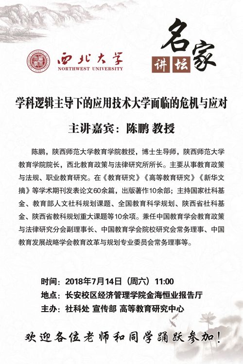 关于举办"名家讲坛"暨"高等教育论坛"(第十四期)的通知 作者: 编辑: 时间:2018-07-12 11:50 校内各有关单位:星空app官网名家讲坛暨高等教育论坛(第十四期)即将举行,现将具体情况通知如下:讲座题目:学科逻辑主导下的应用技术大学面临的危机与应对主讲嘉宾:陈 鹏 教授讲座时间:7月14日(周六)11:00讲座地点:星空app官网长安校区经济管理学院金海恒业报告厅主办单位:社科处、宣传部、高等教育研究中心欢迎各位老师和同学踊跃参加!
