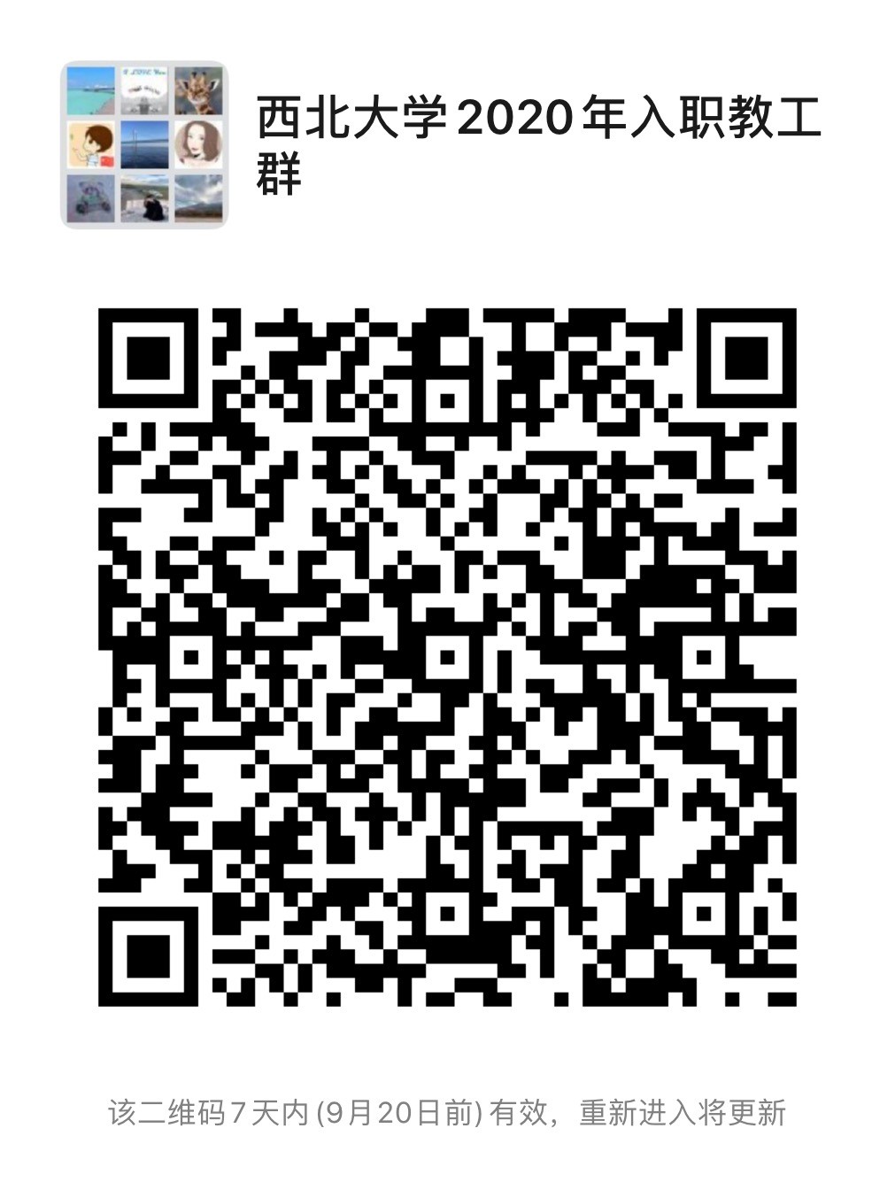 5.请各新进校教职工加入2020年西大新进教工QQ群(群号915031454)和微信群(扫描下方二维码进入),并按照“单位+姓名”格式修改备注名。