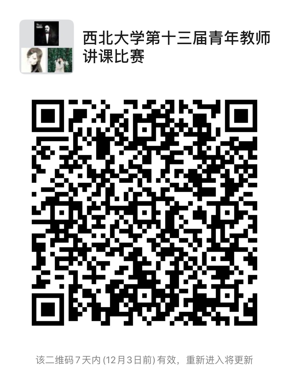 6.请参赛教师扫描下方二维码,加入“星空app官网第十三届青年教师讲课比赛”微信群,并按照“单位+姓名”格式修改备注名。
