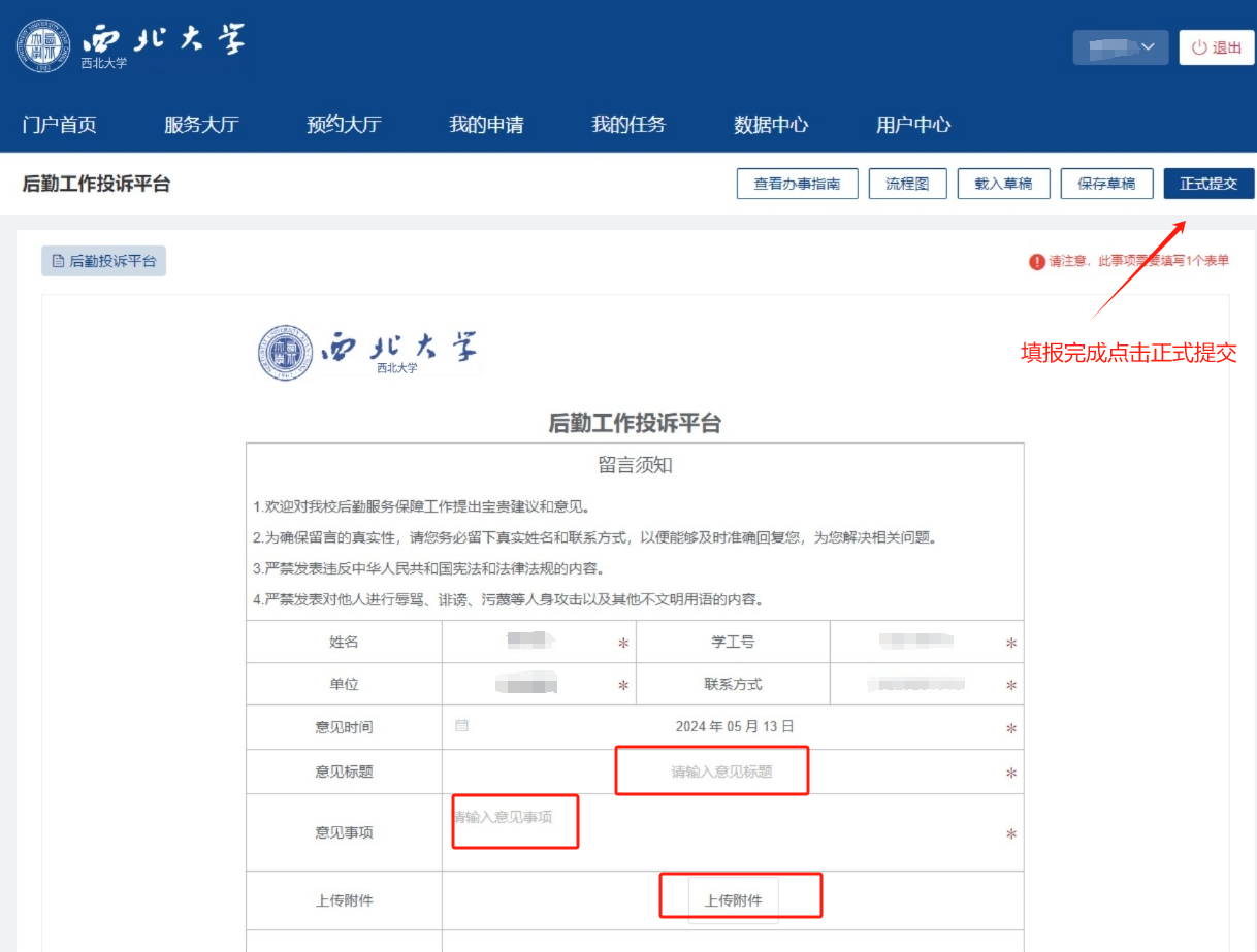 ②随即跳转到网上办事大厅“后勤服务反馈平台”页面,师生填写意见标题、意见事项并根据需求选择是否上传附件,点击“正式提交”即完成留言投诉。