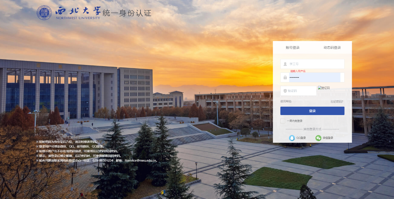 ①自动跳转到学校统一身份认证页面,师生输入学号/工号及个人账号密码验证身份信息;