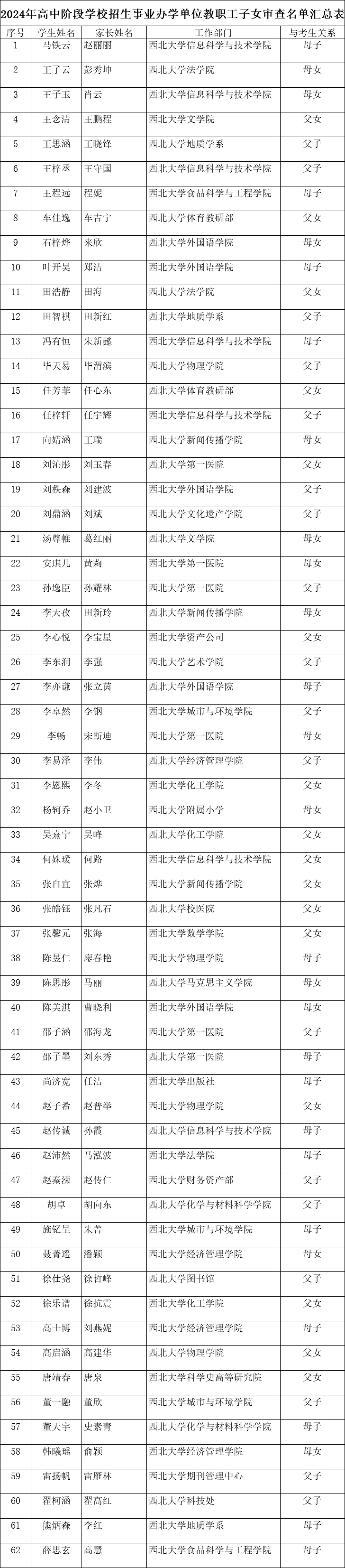 关于2024年高中阶段学校招生星空app官网 正式事业编制的教职工直系初中应届毕业子女审查结果的公示 作者:附中 编辑:附中 时间:2024-05-13 根据市、区教育局通知及要求,星空app官网于2024年5月6日开展2024年高中阶段学校招生星空app官网正式事业编制的教职工直系初中应届毕业子女审查工作。经大学人力资源部门、纪检部门审核,通过名单如下(按学生姓氏笔画数排序): 现予以公示,公示时间为5月13日至5月19日。公示期内,如对公示名单有异议,可通过来电形式向星空app官网反映。 电 话:88363909 星空app官网附属中学 2024年5月13日