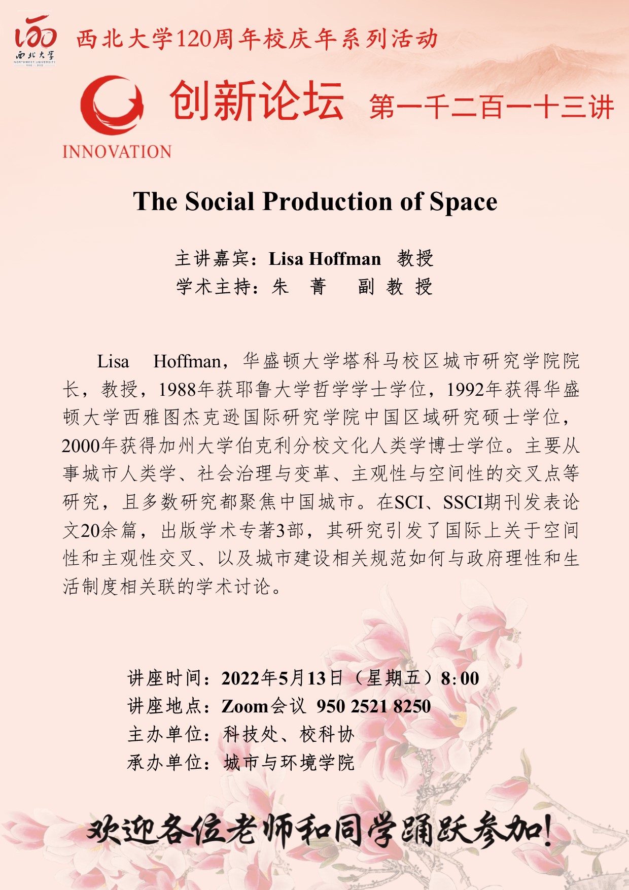 星空app官网创新论坛第一千二百一十三讲暨120周年校庆年系列活动:The Social Production of Space 作者:Lisa Hoffman 教授 编辑: 时间:2022-05-12