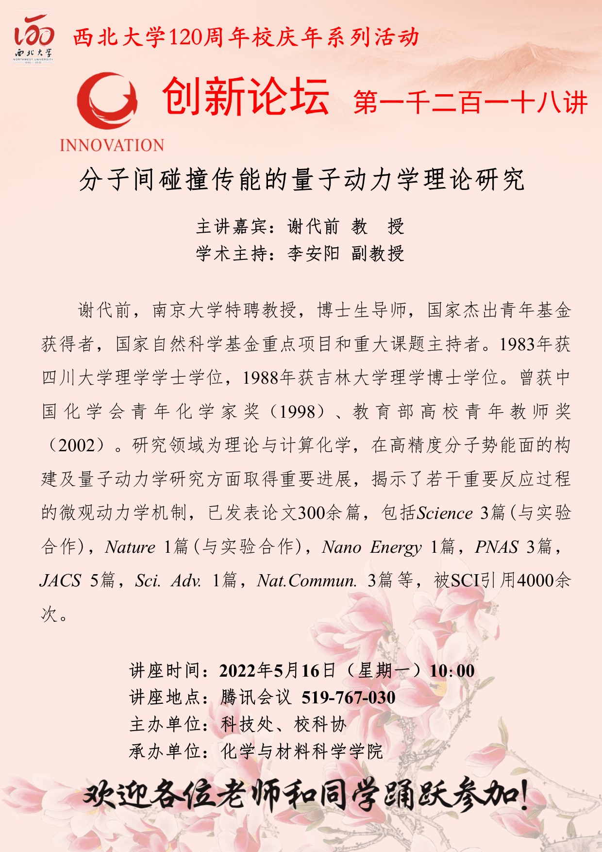 星空app官网创新论坛第一千二百一十八讲暨120周年校庆年系列活动:分子间碰撞传能的量子动力学理论研究