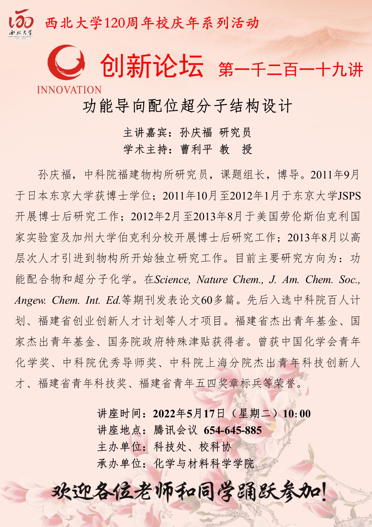星空app官网创新论坛第一千二百一十九讲暨120周年校庆年系列活动:功能导向配位超分子结构设计