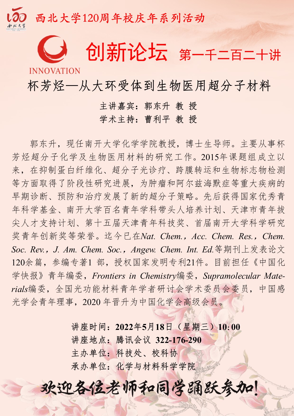 星空app官网创新论坛第一千二百二十讲暨120周年校庆年系列活动:杯芳烃—从大环受体到生物医用超分子材料
