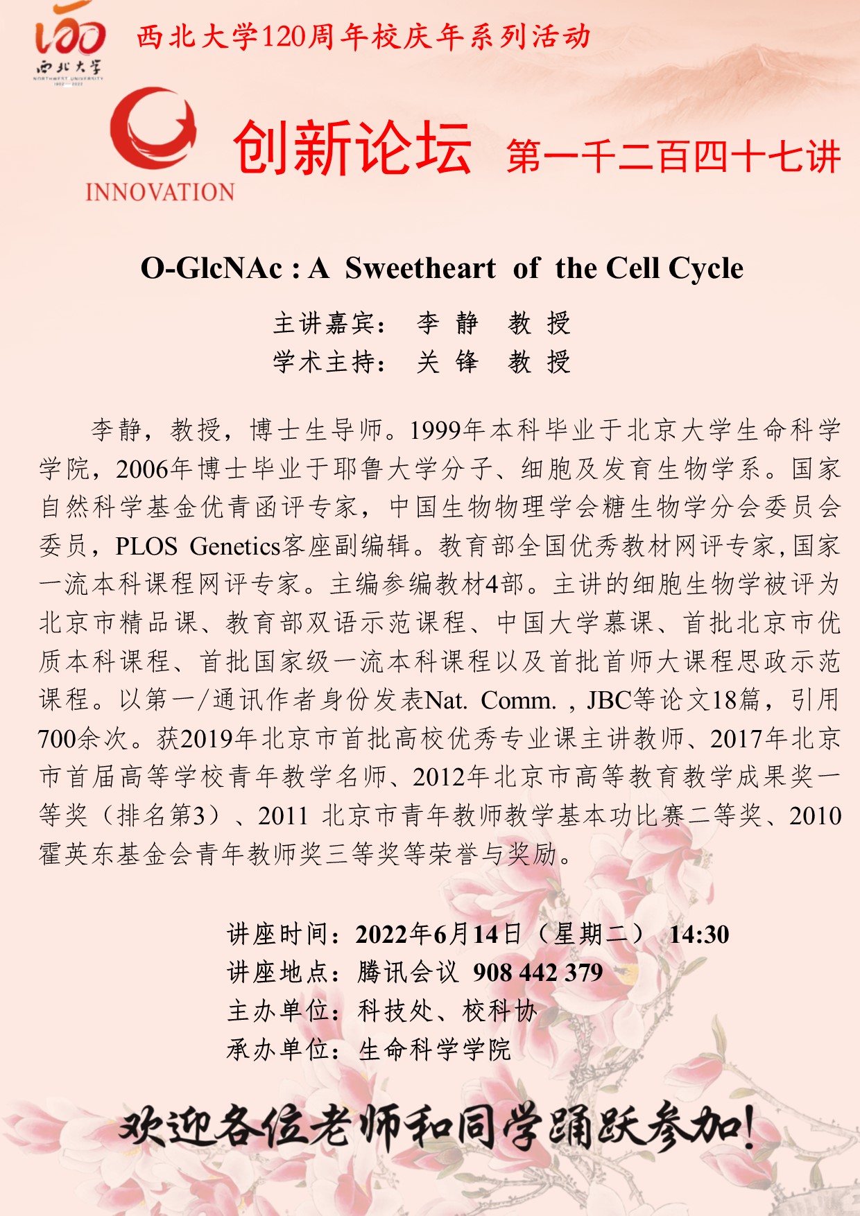 星空app官网创新论坛第一千二百四十七讲暨120周年校庆年系列活动:O-GlcNAc : A Sweetheart of the Cell Cycle 作者:李 静 教 授 编辑: 时间:2022-06-13