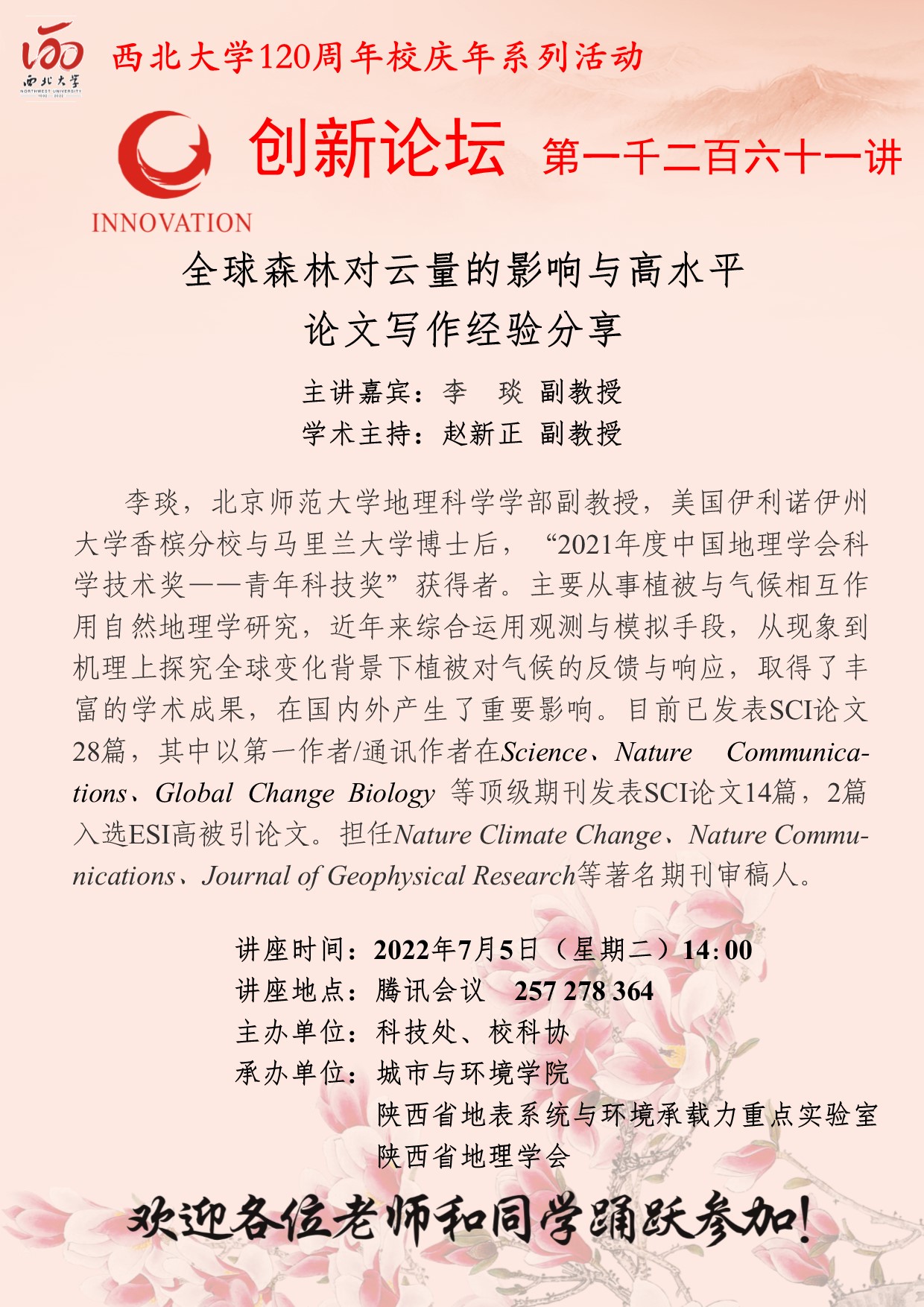 星空app官网创新论坛第一千二百六十一讲暨120周年校庆年系列活动:全球森林对云量的影响与高水平论文写作经验分享