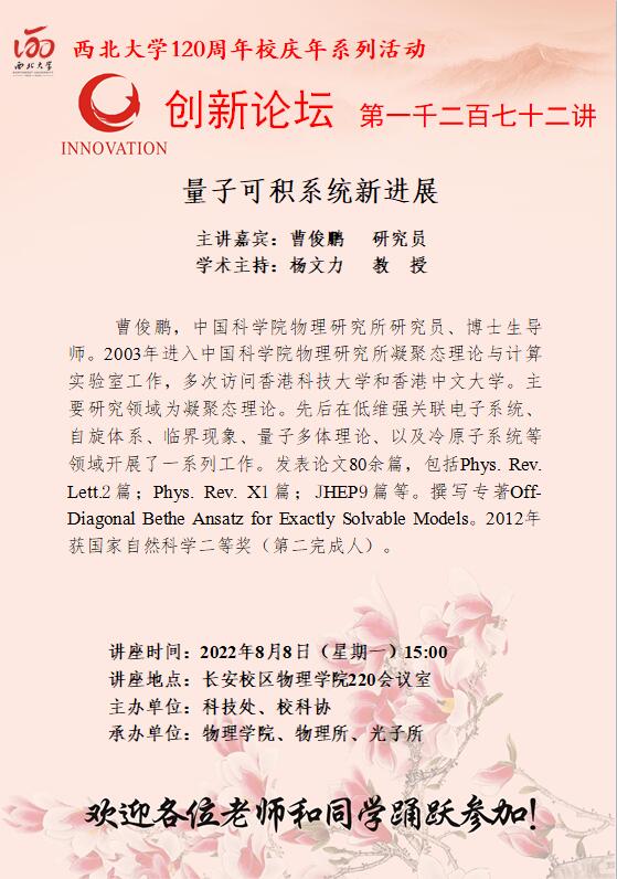 星空app官网创新论坛第一千二百七十二讲暨120周年校庆年系列活动:量子可积系统新进展