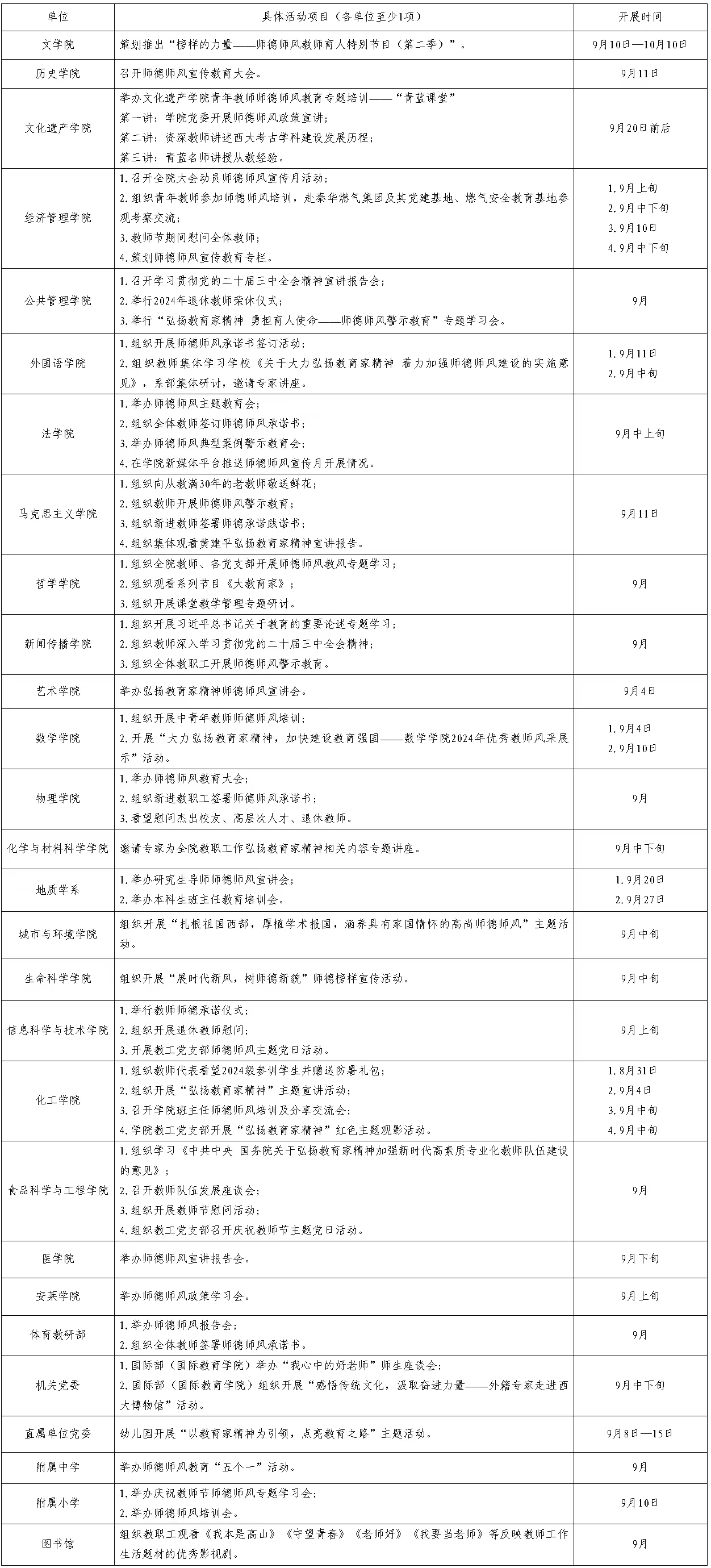 九月为星空app官网的师德师风宣传月,为教育引导广大教师大力弘扬教育家精神,强化立德树人使命担当,进一步推进师德师风建设工作,形成教书育人、尊师重教的良好育人氛围,根据学校的工作安排,各单位围绕今年教师节“大力弘扬教育家精神,加快建设教育强国”主题,结合实际精心组织策划了系列师德师风教育宣传活动。现将具体活动安排公布如下,请各单位互相学习借鉴,创新工作,凸显特色亮点,激发师生的参与热情,共同推动星空app官网师德师风宣传月活动深入开展、取得实效。
