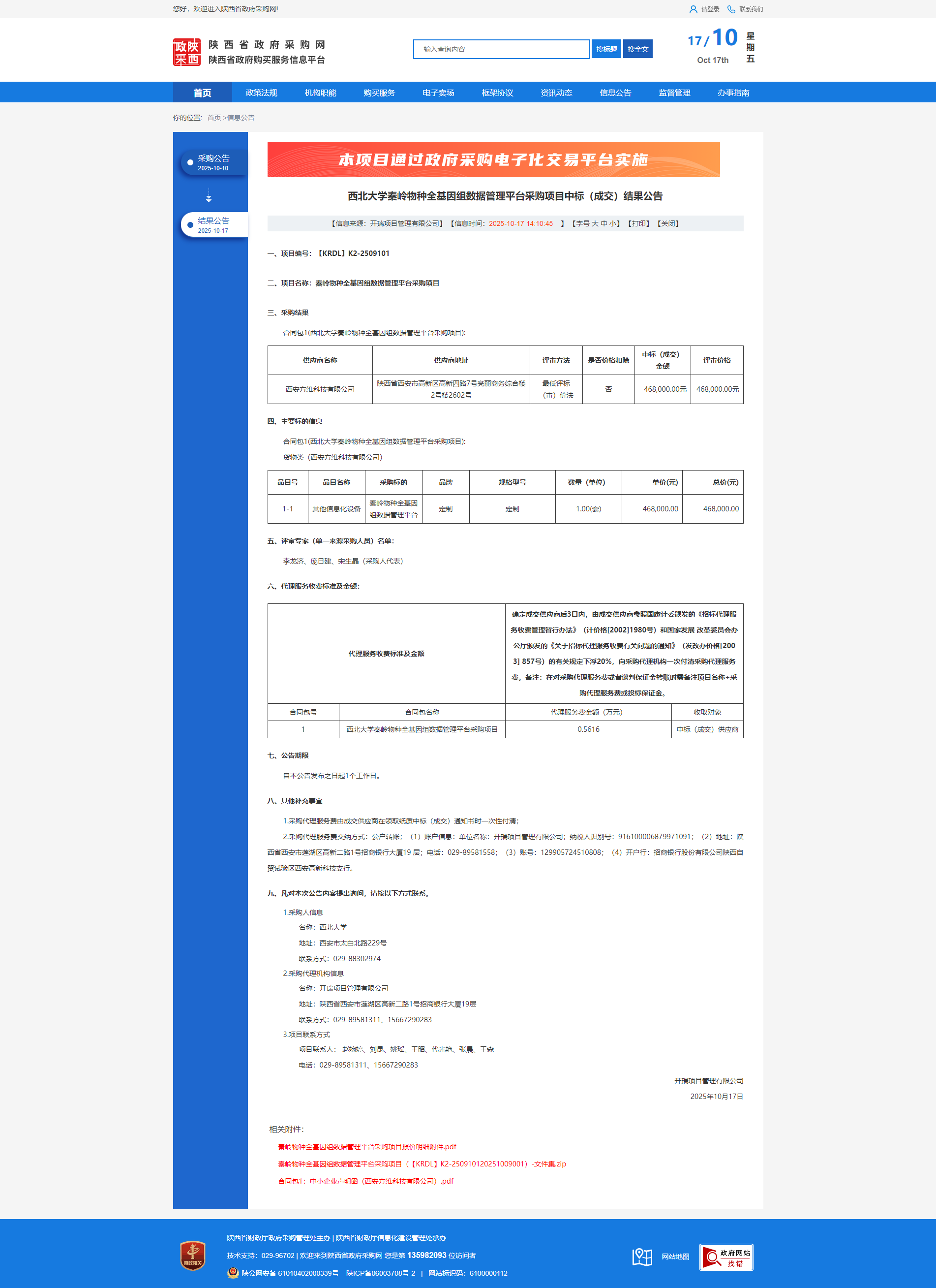 星空app官网秦岭物种全基因组数据管理平台采购项目中标(成交)结果公告
