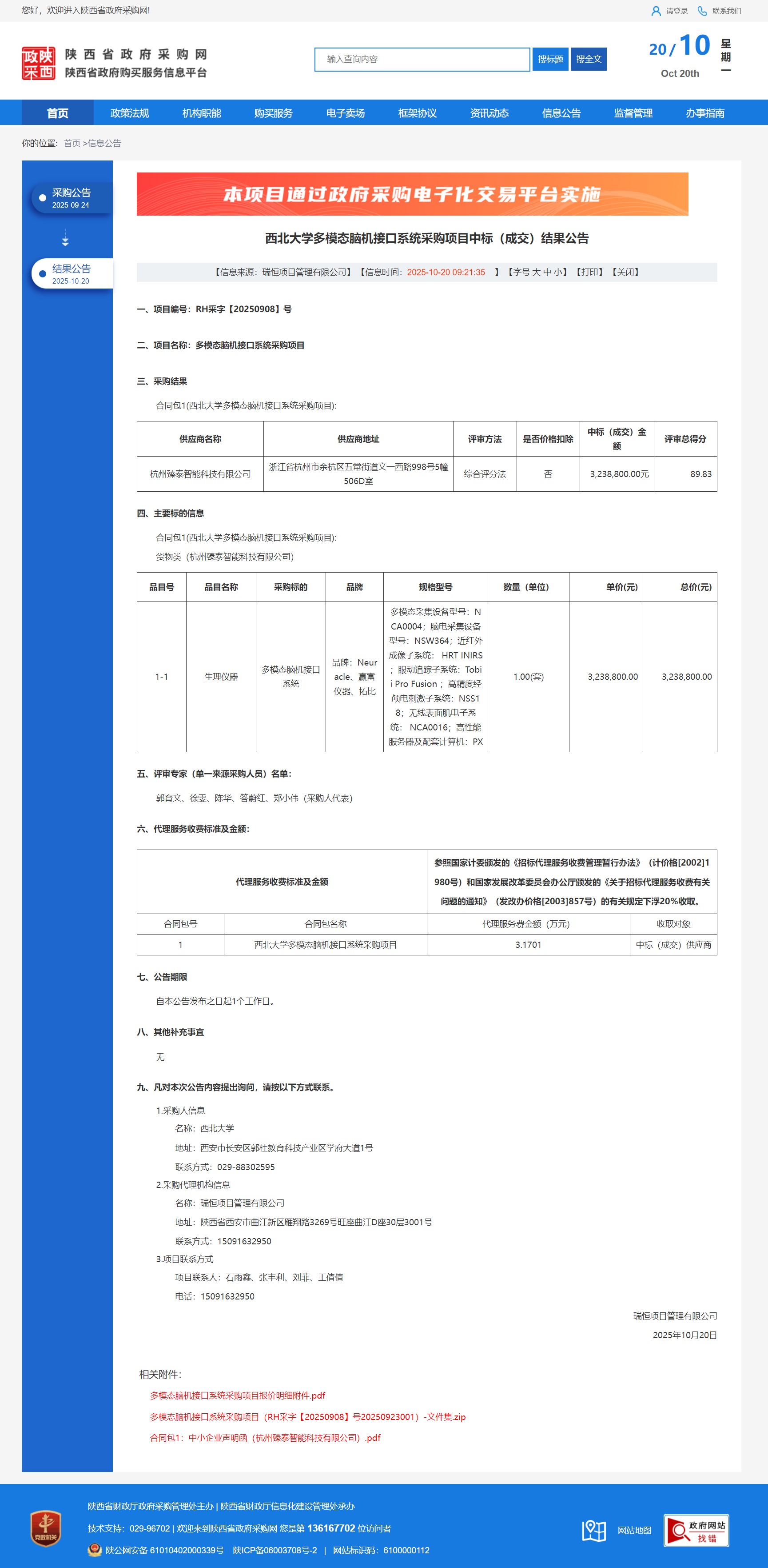 星空app官网多模态脑机接口系统采购项目中标(成交)结果公告