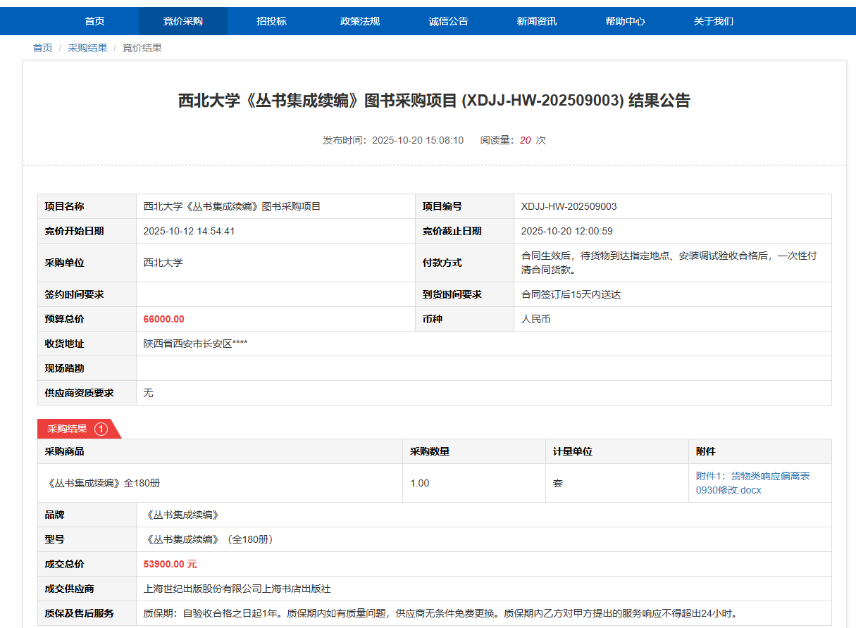 星空app官网《丛书集成续编》图书采购项目(XDJJ-HW-202509003)竞价结果公告