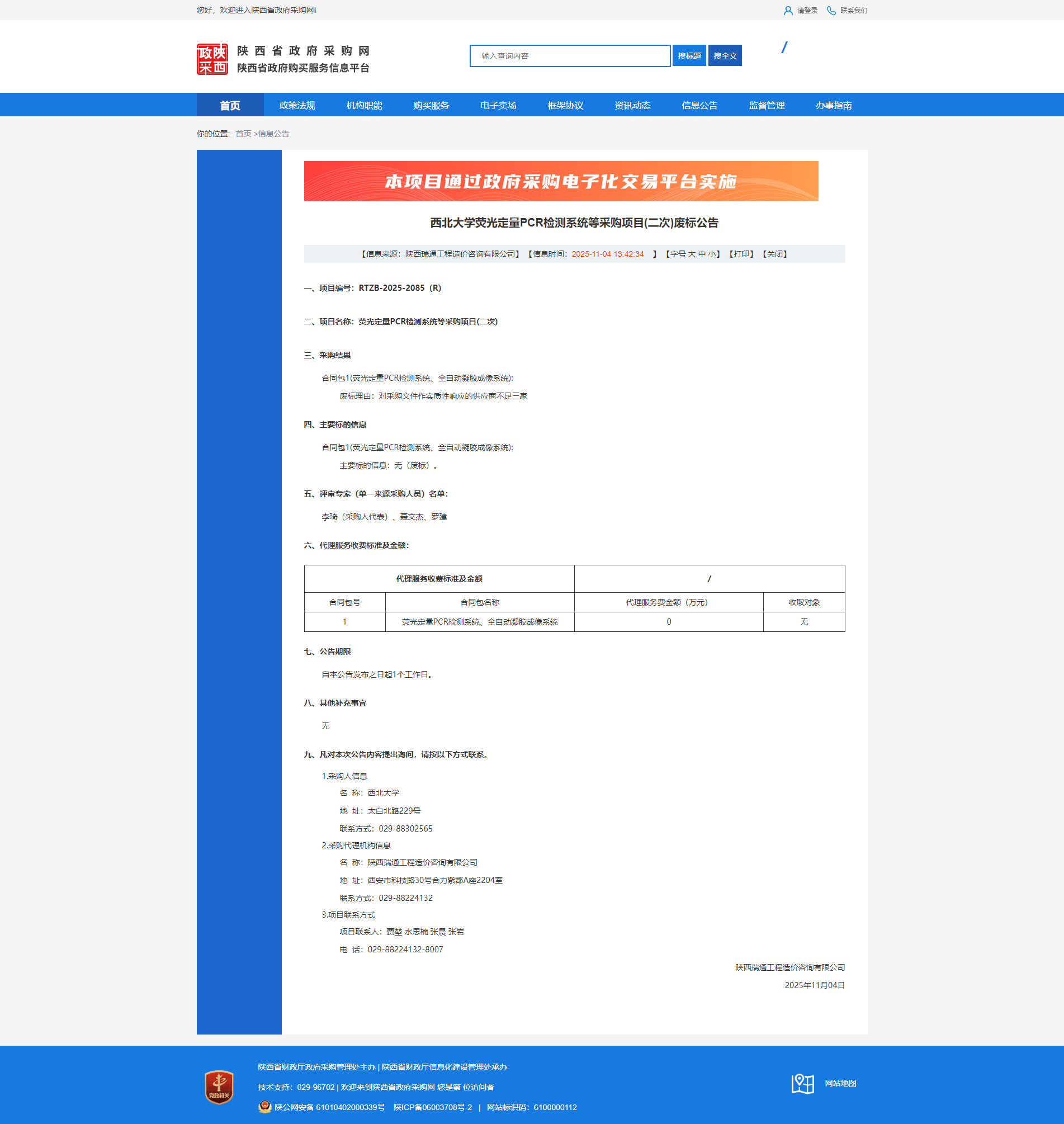 星空app官网荧光定量PCR检测系统等采购项目(二次)废标公告