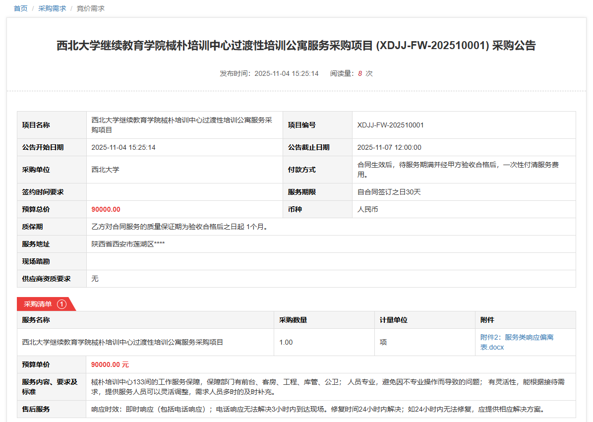 星空app官网继续教育学院棫朴培训中心过渡性培训公寓服务采购项目(XDJJ-FW-202510001)竞价采购公告